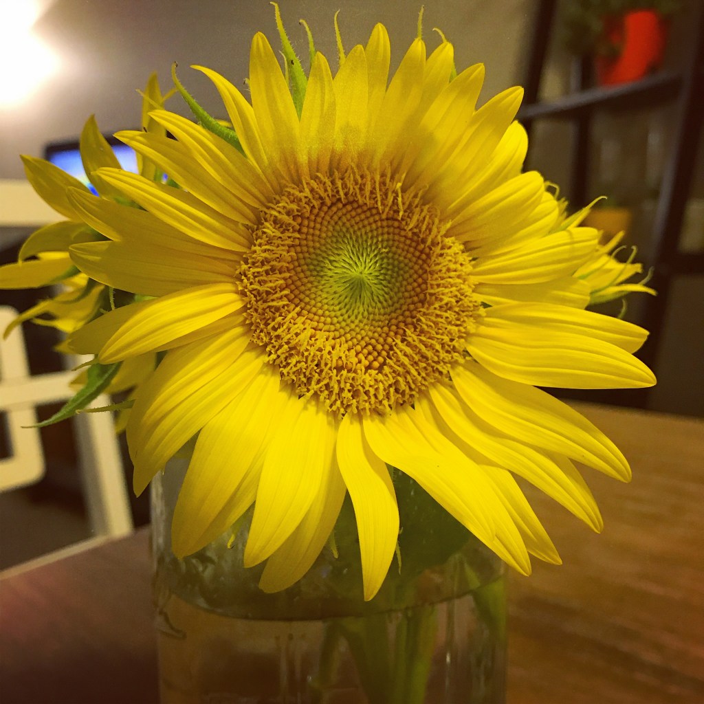 This is a sunflower from my sunflower garden. Today I worked for an hour, weeding out a lot of the plants that were choking some of the smaller sunflowers. It has been a long time since I gardened, but it felt good to be in touch with the earth again. Lately, I have been filling my home with houseplants — majesty palms, sad aloe vera that I rescued from the grocery store bottom shelf, many succulents, and dragon tree. It feels nice to have a space to watch things grow.